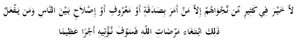 «Многие из их тайных бесед не приносят добра, если только они не призывают раздавать милостыню, совершать одобряемое или примирять людей. Тому, кто поступает таким образом, стремясь к довольству Аллаха, Мы даруем великую награду» (Коран, 4: 114).